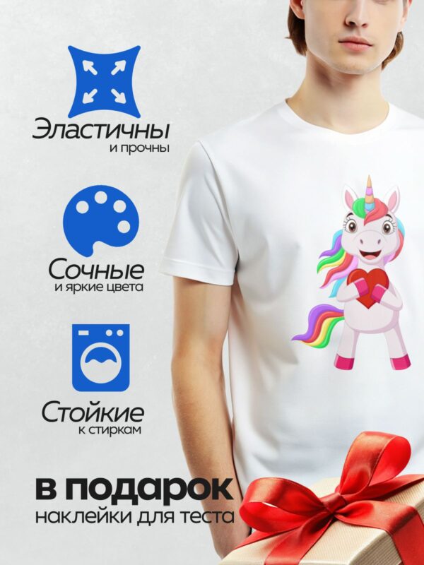 Термонаклейка на одежду DTF / Милый единорог с радужной гривой держит красное сердце.