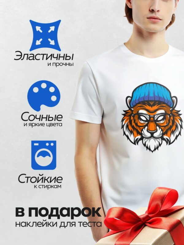 Термонаклейка на одежду DTF / Мультяшный тигр в синей шапке и очках.
