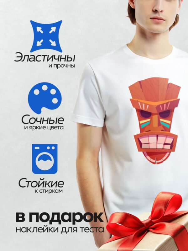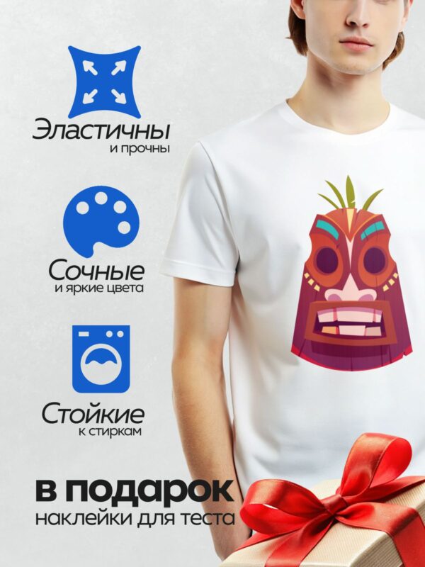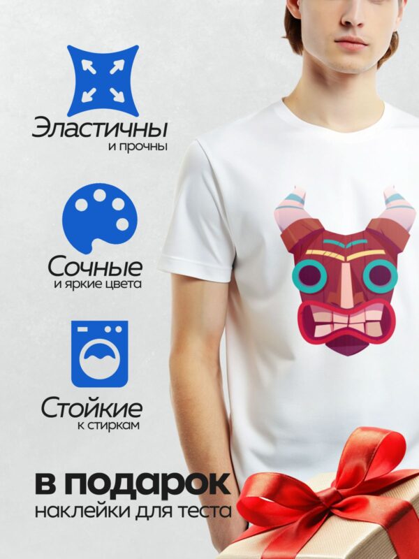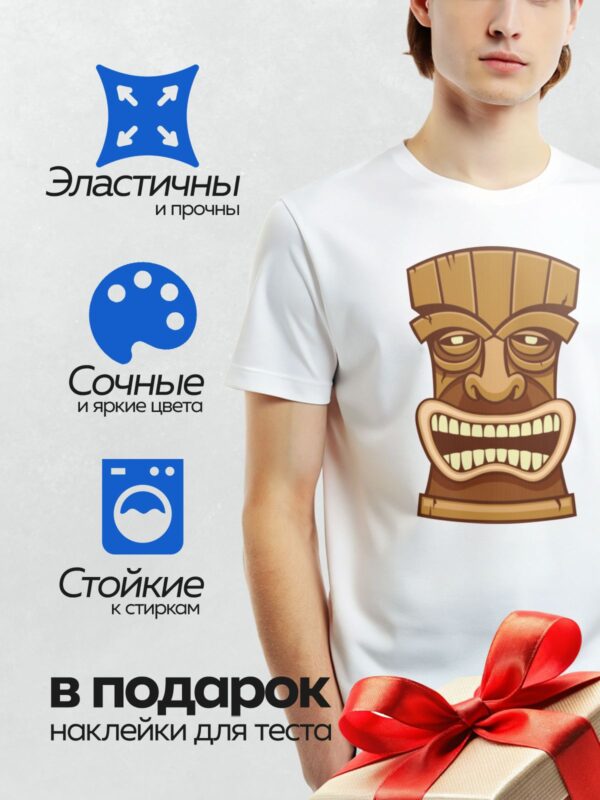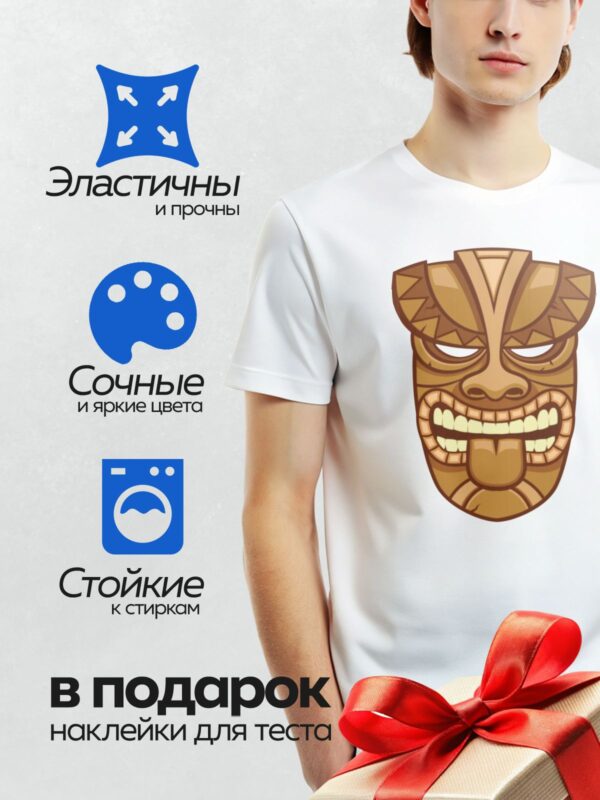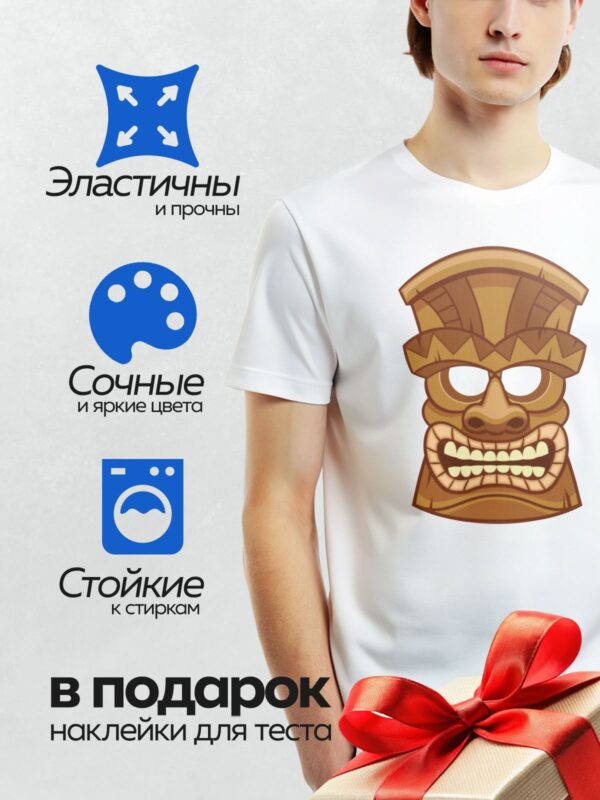 Термонаклейка на одежду DTF / Маска тики с широкой улыбкой и яркими акцентами.