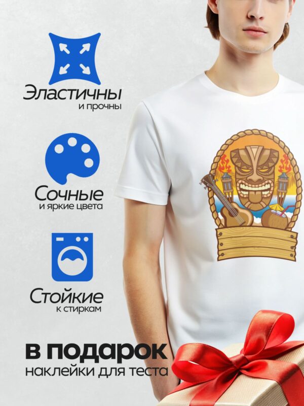 Термонаклейка на одежду DTF / Гавайская маска тики, укулеле, кокос, факелы, закат.