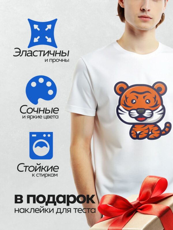 Термонаклейка на одежду DTF / Мультяшный тигрёнок с разноцветной гирляндой.