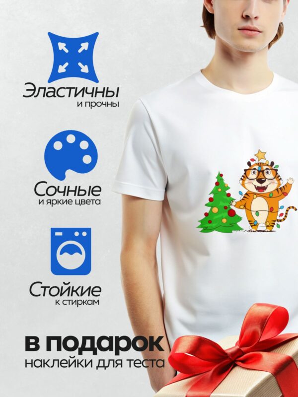 Термонаклейка на одежду DTF / Мультяшный тигр украшает новогоднюю ёлку.