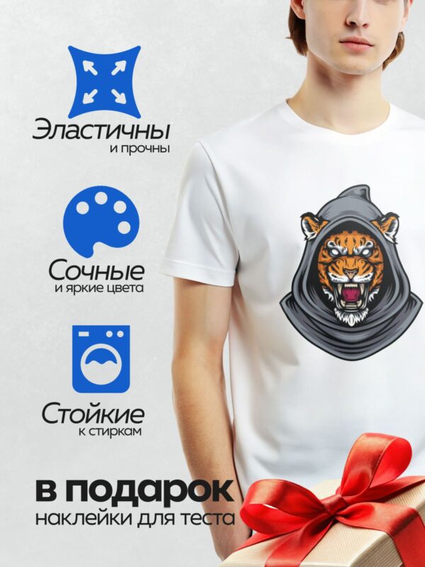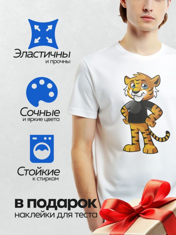 Термонаклейка на одежду DTF / Мультяшный тигр в черной футболке, стоит уверенно.