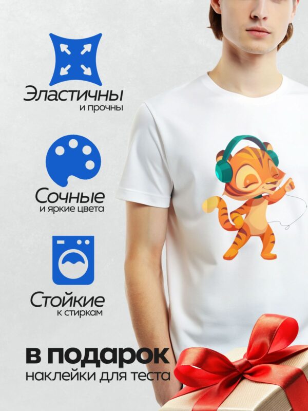 Термонаклейка на одежду DTF / Мультяшный тигр в наушниках танцует с радостью.
