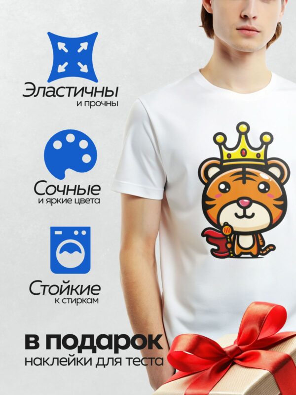 Термонаклейка на одежду DTF / Мультяшный тигр в короне, с жезлом и плащом.