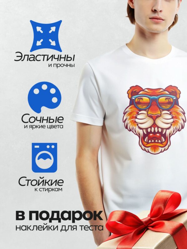Термонаклейка на одежду DTF / Стилизованная голова тигра в оранжево-черных тонах. Тигр в солнечных очках, с яркими цветами и динамичным дизайном.