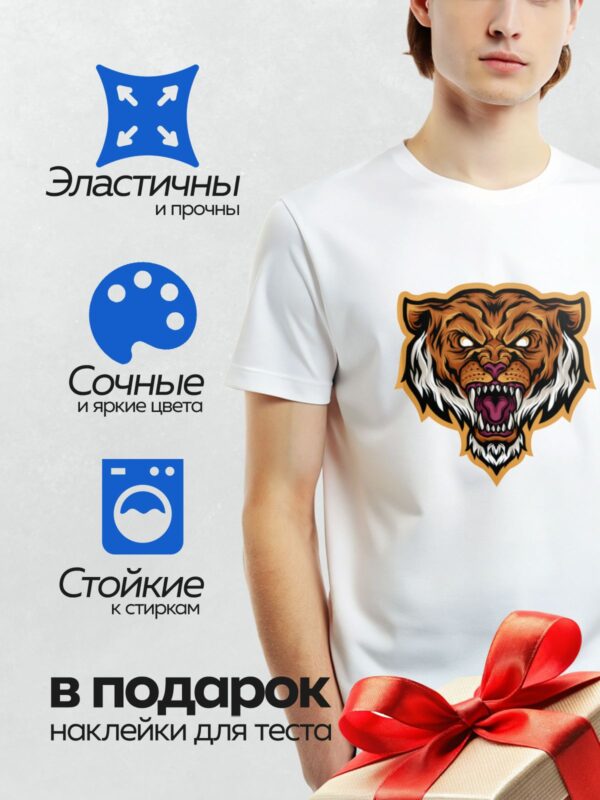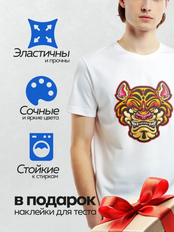 Термонаклейка на одежду DTF / Стилизованная голова тигра с агрессивным выражением.