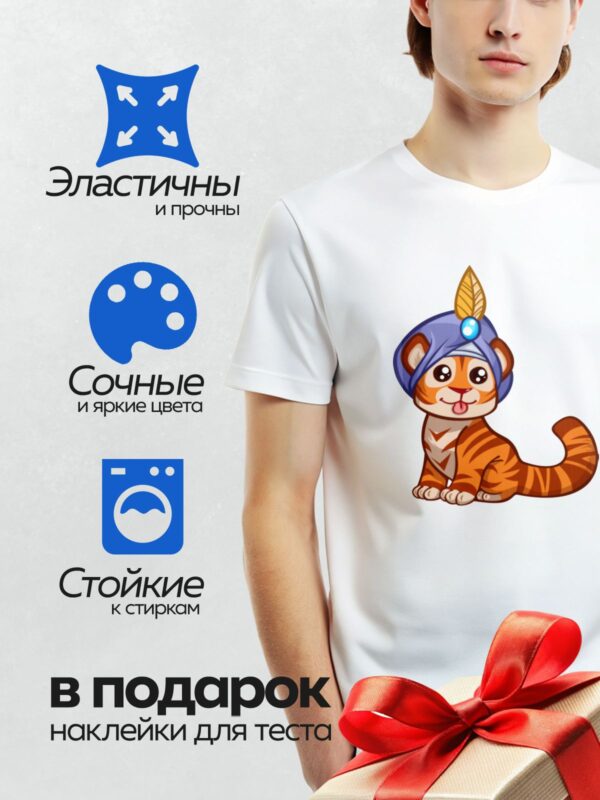 Термонаклейка на одежду DTF / Мультяшный тигрёнок в синем тюрбане с пером и камнем.