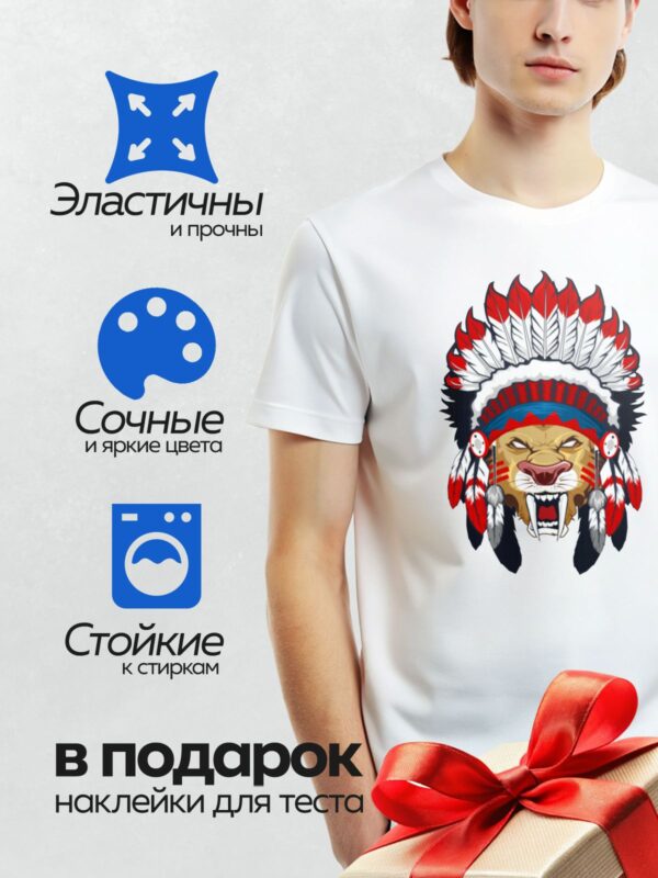 Термонаклейка на одежду DTF / Стилизованный лев в индейском головном уборе, яркий и динамичный.