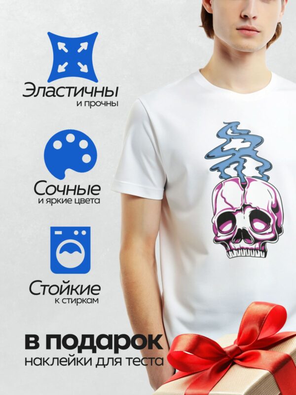Термонаклейка на одежду DTF / Мультяшный череп с синим дымом, стилизованный дизайн.