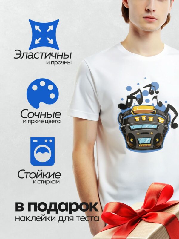 Термонаклейка на одежду DTF / Мультяшный бумбокс с музыкальными нотами и яркими акцентами.