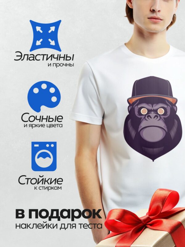 Термонаклейка на одежду DTF / Горилла в кепке с глазами-спиралями, стилизованный рисунок.