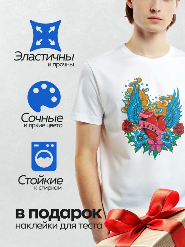 Термонаклейка на одежду DTF / Сердце с крыльями, цветами и надписью “LOVE”.