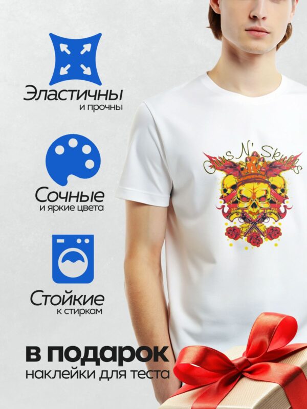 Термонаклейка на одежду DTF / Череп с короной, оружием и розами. Надпись “Guns N’ Skulls”.