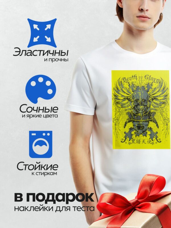 Термонаклейка на одежду DTF / Череп с крыльями, маска самурая, яркие контрасты.