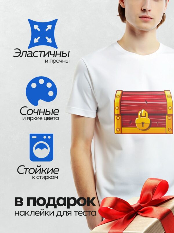 Термонаклейка на одежду DTF / Мультяшный сундук с золотым замком и яркими деталями.