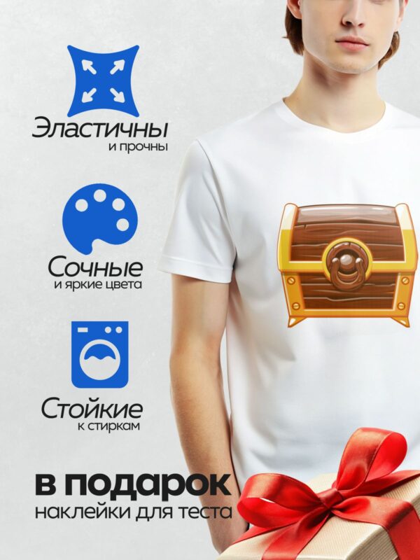 Термонаклейка на одежду DTF / Мультяшный сундук с деревянной текстурой и золотой окантовкой.
