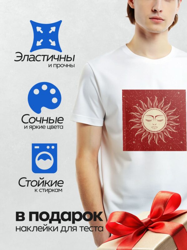 Термонаклейка на одежду DTF / Солнце с закрытыми глазами на красном фоне со звёздами.