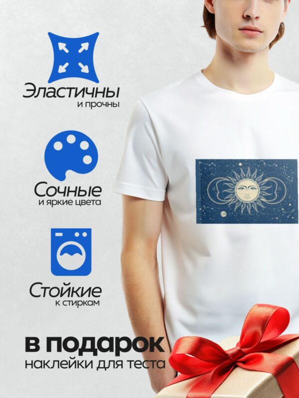 Термонаклейка на одежду DTF / Солнце и Луна с лицами, звезды и созвездия на фоне.