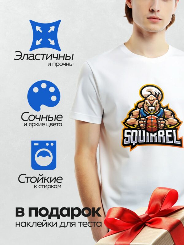 Термонаклейка на одежду DTF / Мускулистая белка с баскетбольным мячом и надписью “SQUIRREL”.