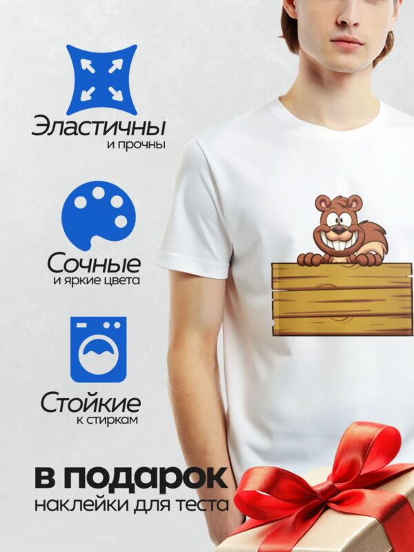 Термонаклейка на одежду DTF / Мультяшный бобр с широкой улыбкой за деревянной табличкой.