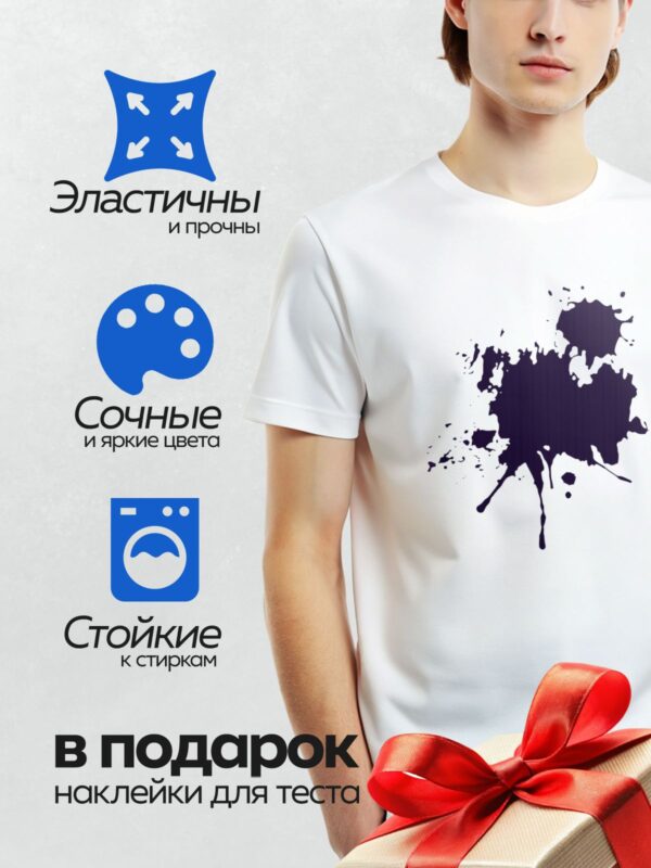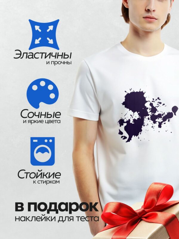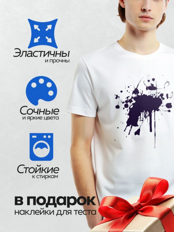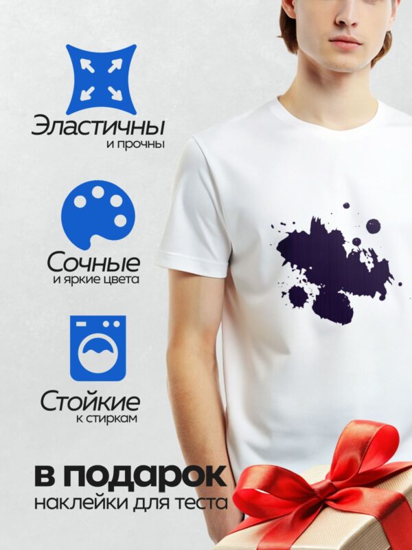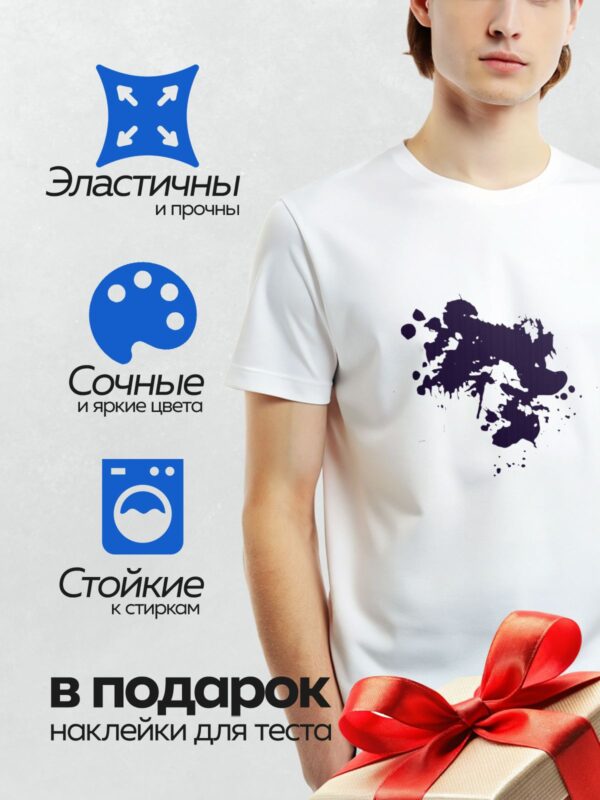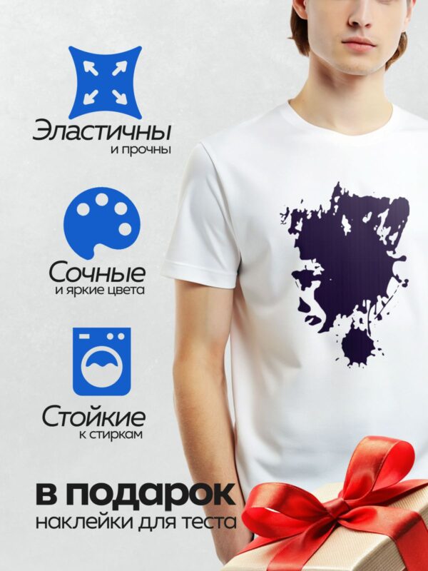 Термонаклейка на одежду DTF / На белом фоне изображена крупная чернильная клякса с размытыми краями и мелкими каплями вокруг.