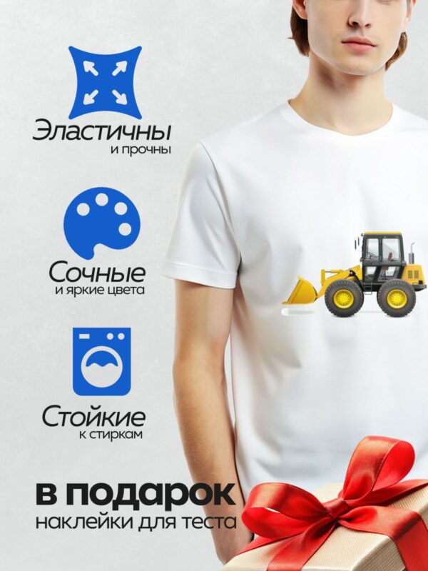 Термонаклейка на одежду DTF / Колесный погрузчик с поднятым ковшом, вид сбоку.
