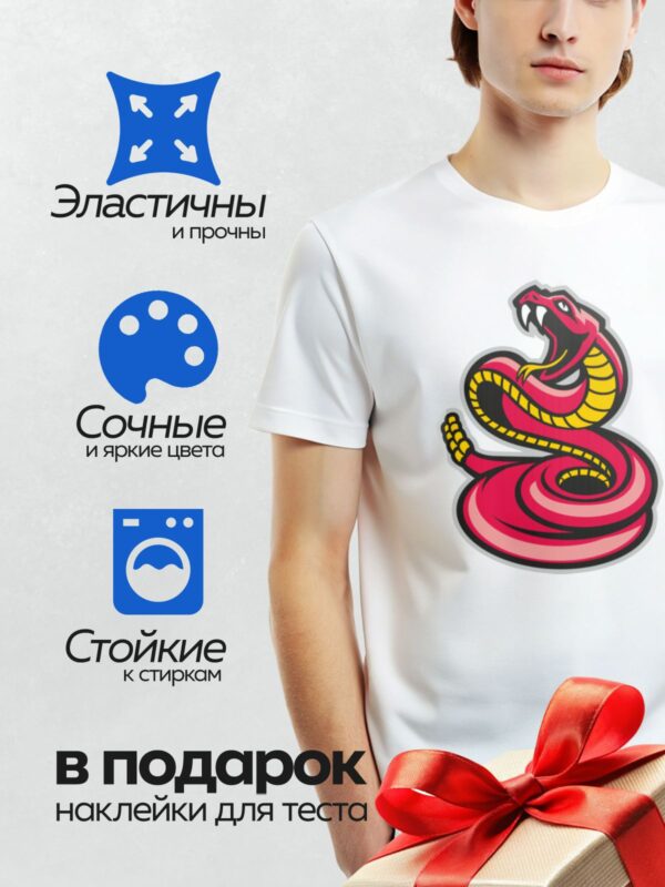 Термонаклейка на одежду DTF / Мультяшная кобра с жёлтыми полосами и раскрытым капюшоном.