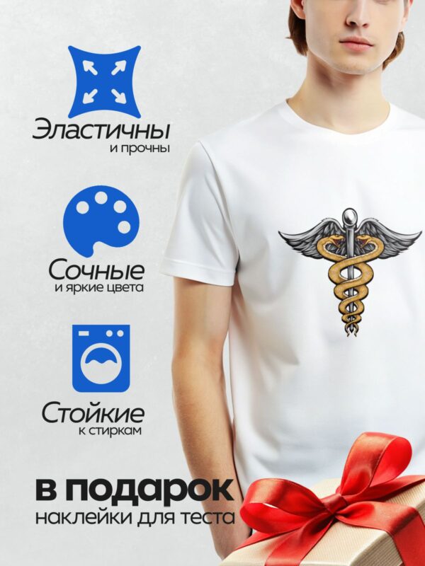 Термонаклейка на одежду DTF / Кадуцей с двумя змеями, крыльями и жезлом.