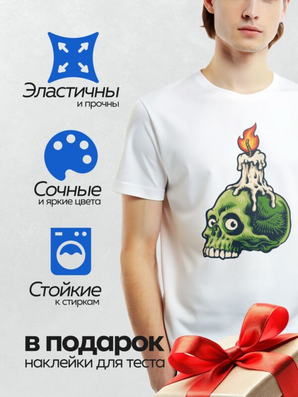 Термонаклейка на одежду DTF / Мультяшный зелёный череп с горящей свечой.