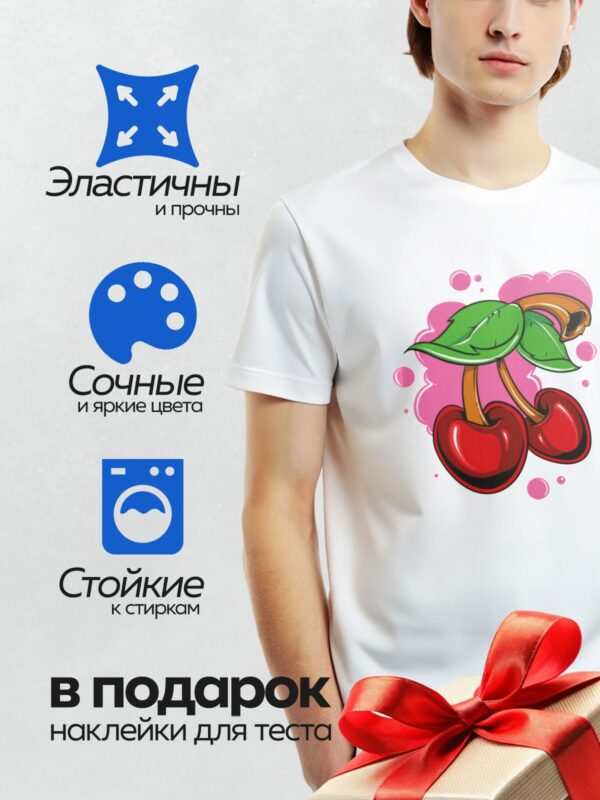 Термонаклейка на одежду DTF / Две яркие мультяшные вишни с зелёными листьями.