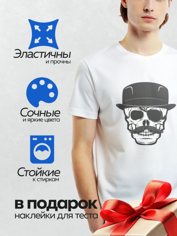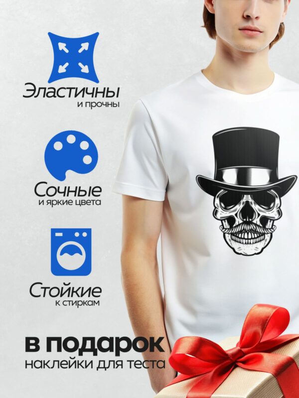 Термонаклейка на одежду DTF / Череп в цилиндре с густыми черными усами.