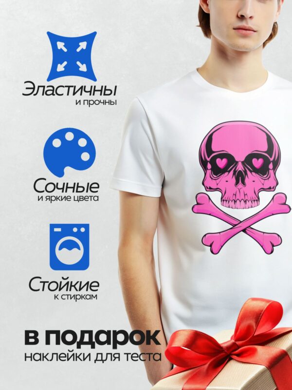 Термонаклейка на одежду DTF / Розовый череп с сердечками вместо глаз и скрещёнными костями.