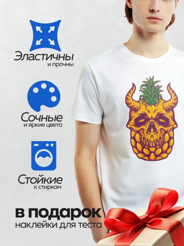 Термонаклейка на одежду DTF / Яркий ананас в виде черепа с рогами и зелёной короной.