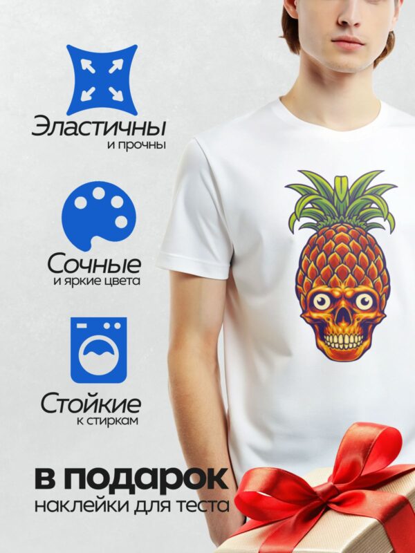 Термонаклейка на одежду DTF / Яркий череп в форме ананаса с зелёной короной.