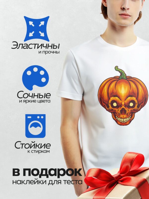 Термонаклейка на одежду DTF / Тыква в форме черепа с яркими глазами и зубами.