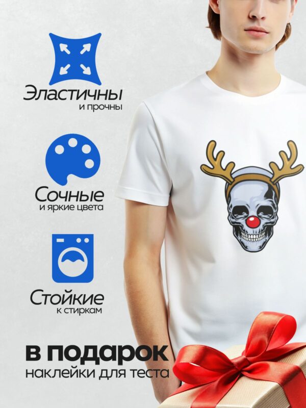 Термонаклейка на одежду DTF / Стилизованный череп с оленьими рогами и красным носом.