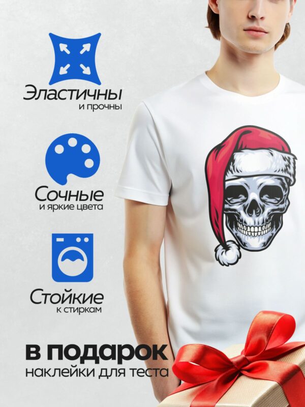 Термонаклейка на одежду DTF / Череп в красной шапке Санты с белым мехом.