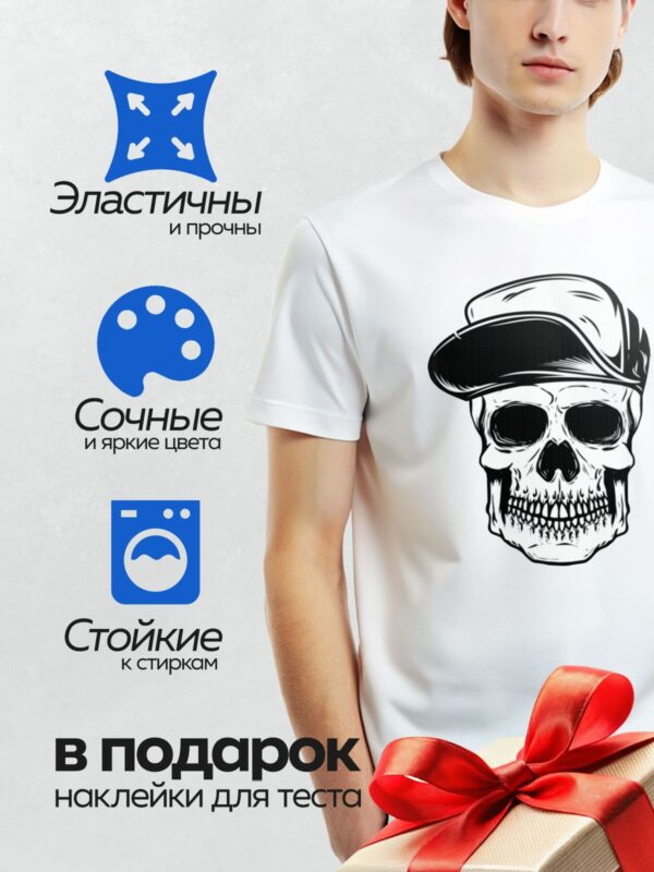 Термонаклейка на одежду DTF / Стилизованный череп в кепке, черно-белый рисунок.