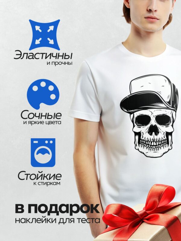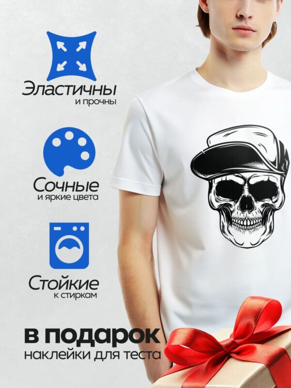Термонаклейка на одежду DTF / Череп в шапке и очках, стилизованный, черно-белый.
