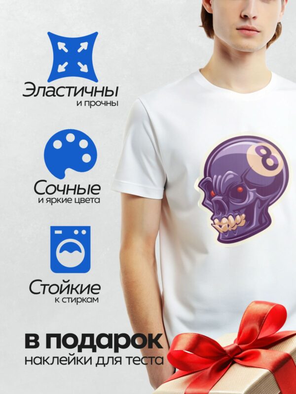 Термонаклейка на одежду DTF / Фиолетовый череп с красными глазами и номером 8.
