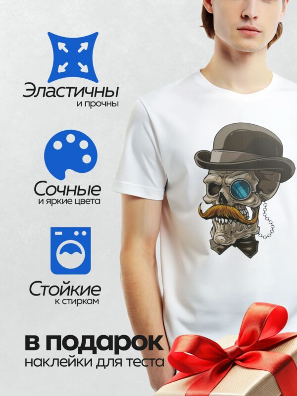 Термонаклейка на одежду DTF / Мультяшный череп джентльмена с усами, шляпой и моноклем.