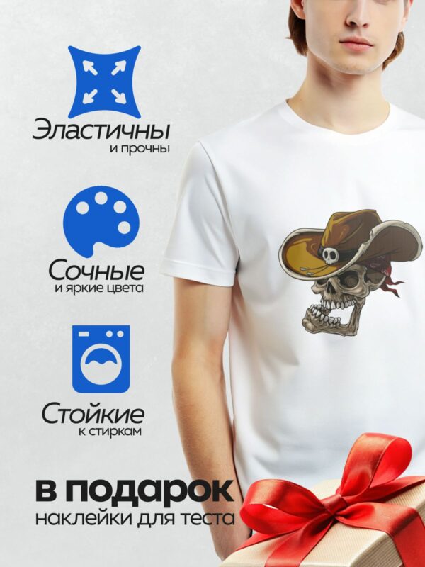 Термонаклейка на одежду DTF / Мультяшный череп в ковбойской шляпе с банданой.