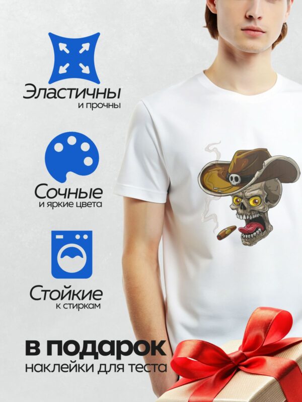 Термонаклейка на одежду DTF / Мультяшный череп в ковбойской шляпе с сигарой.