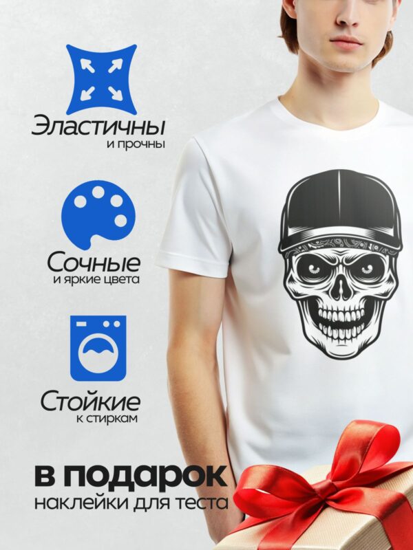 Термонаклейка на одежду DTF / Череп в кепке с банданой, стилизованный рисунок.