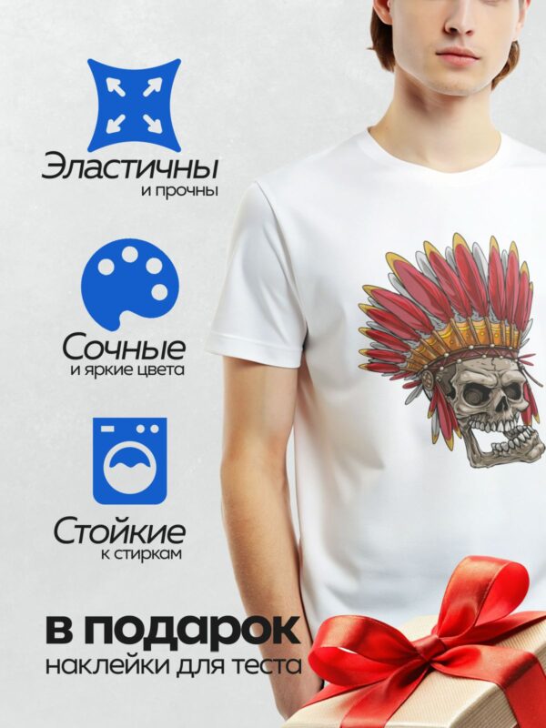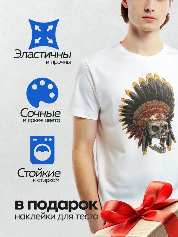 Термонаклейка на одежду DTF / Череп в индейском головном уборе с яркими перьями.