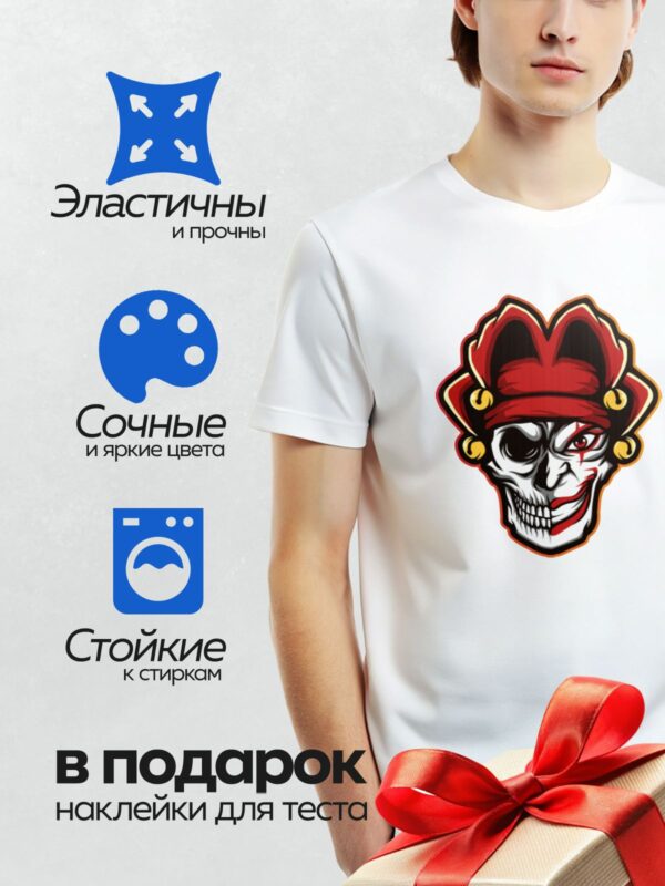 Термонаклейка на одежду DTF / Стилизованный череп шута с красной шляпой и колокольчиками.