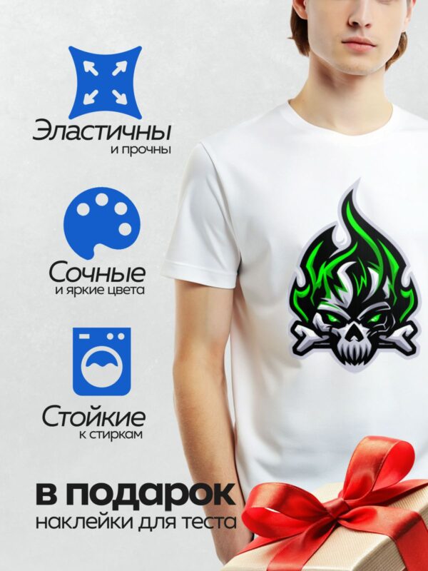 Термонаклейка на одежду DTF / Стилизованный череп с зелёным пламенем и костями.
