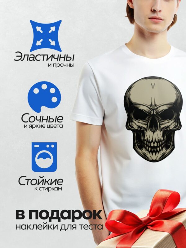 Термонаклейка на одежду DTF / Стилизованный череп в векторном стиле, черно-белая графика.