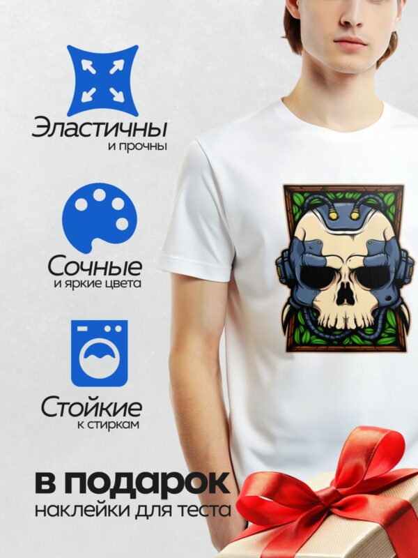 Термонаклейка на одежду DTF / Стилизованный череп в больших наушниках.